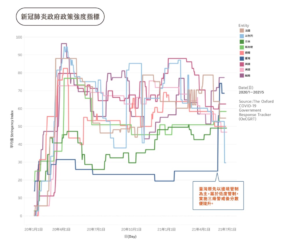 依據此項指標,越南、以色列是圖中政策相對嚴格的國家。法國、英國執行封城期間(Lockdown),分數便直逼 90。臺灣原先以邊境管制為主,屬於低度管制,實施三級警戒後便陡升超過 70 分。