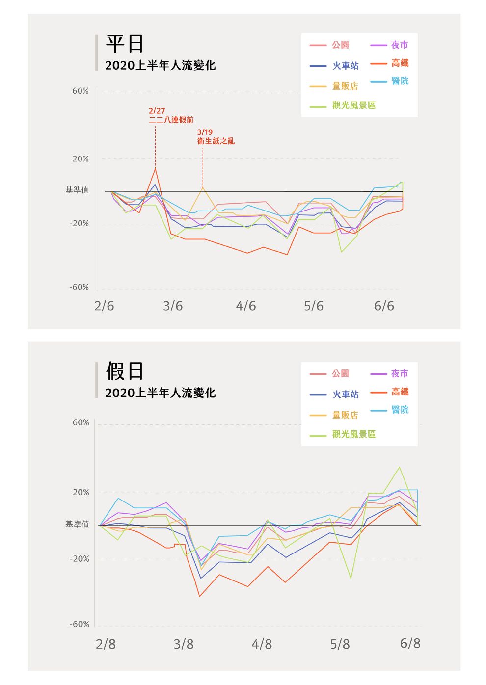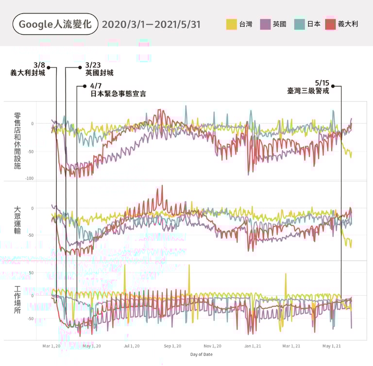 檢視人流有三個關鍵場所:工作場所、交通樞紐、購物商場,對疫情控制皆有重要影響。