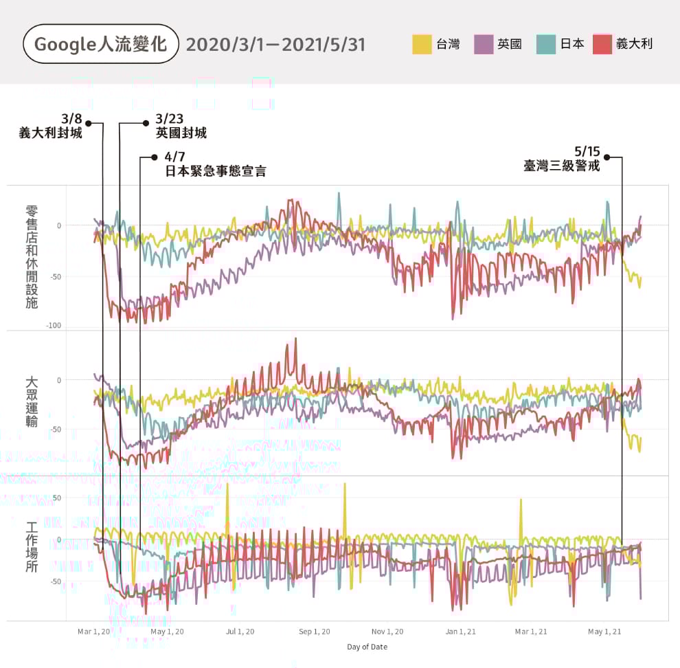 以 Google Mobility 比較各國人流,英國、法國在第一次封城後,大眾運輸、零售店減少約 7-8 成人潮;義大利下降約 9 成;臺灣三級警戒後人流下降約 6-7 成;日本發布緊急事態宣言後,人潮則減少約 1-3 成。