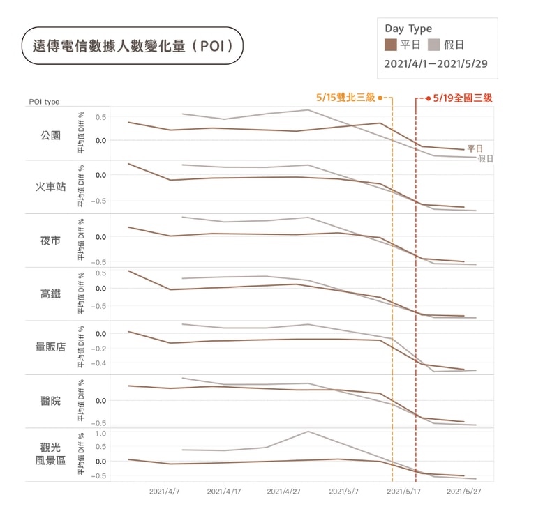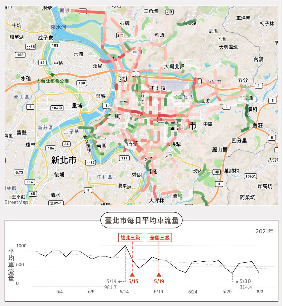 這些人流模式皆成為重要的防疫參考。今年端午連假前夕,政府便強力呼籲減少返鄉移動、降低雙鐵負載量,新北市也關閉部分觀光風景區。