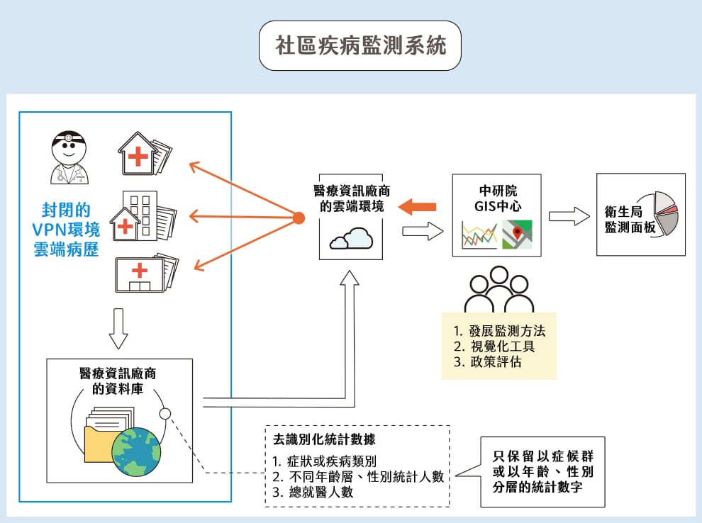 監測系統承襲過去由定點醫師回報流感、腸病毒的概念,但改用資訊化系統,不需要耗費醫生通報人力。加入監測網的醫療院所,只要在健保系統中輸入特定症狀代碼,便能提供衛生單位,即時觀察社區流行病的潛伏、蔓延狀況。