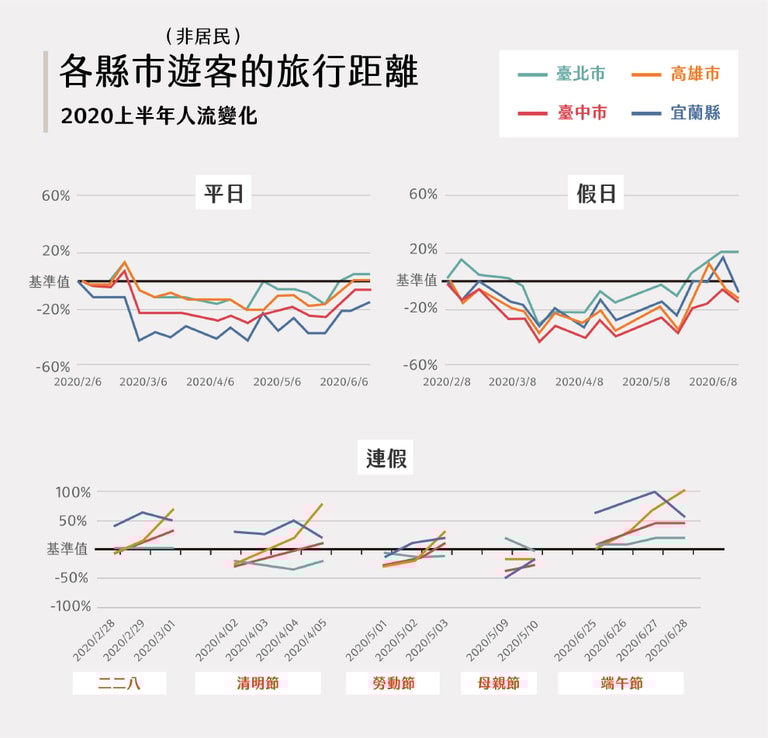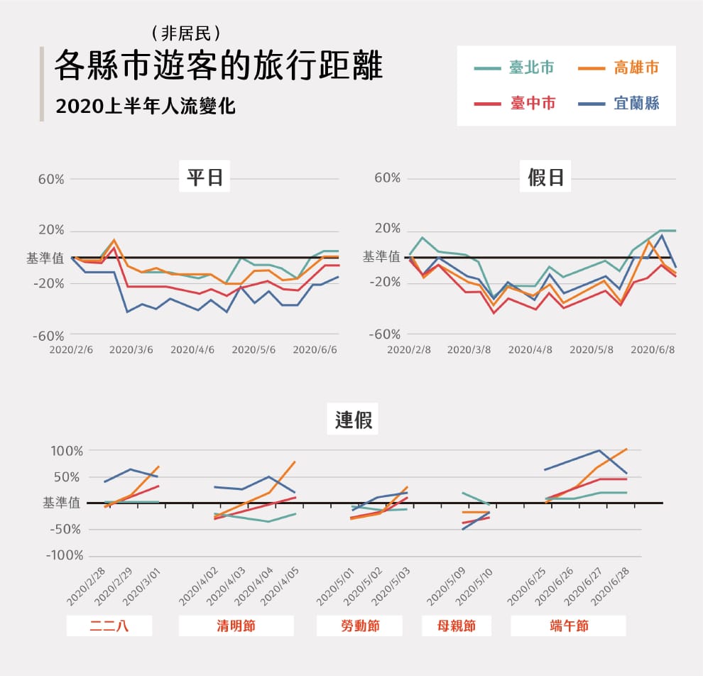 觀察跨縣市人流, 2020 年上半年,每到連假各縣市便湧現旅客,多由北部往南部、東部移動,例如高雄、宜蘭的非居民量大增。隨著疫情趨緩 ,5、6 月後假日人潮不斷攀升,端午連假時移動距離達到高峰、觀光區人潮大增,成為南來北往最大量的連續假期!