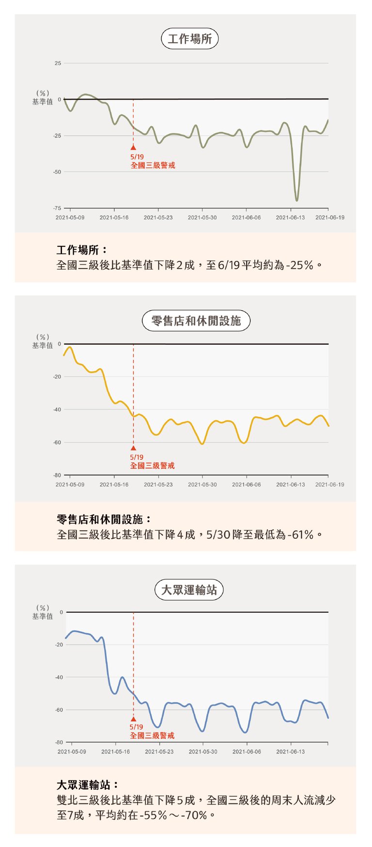 2021 年 5 月臺灣首度進入三級警戒後,人流減少了嗎?哪些地方降幅最明顯?首先透過 Google 數據來觀察。