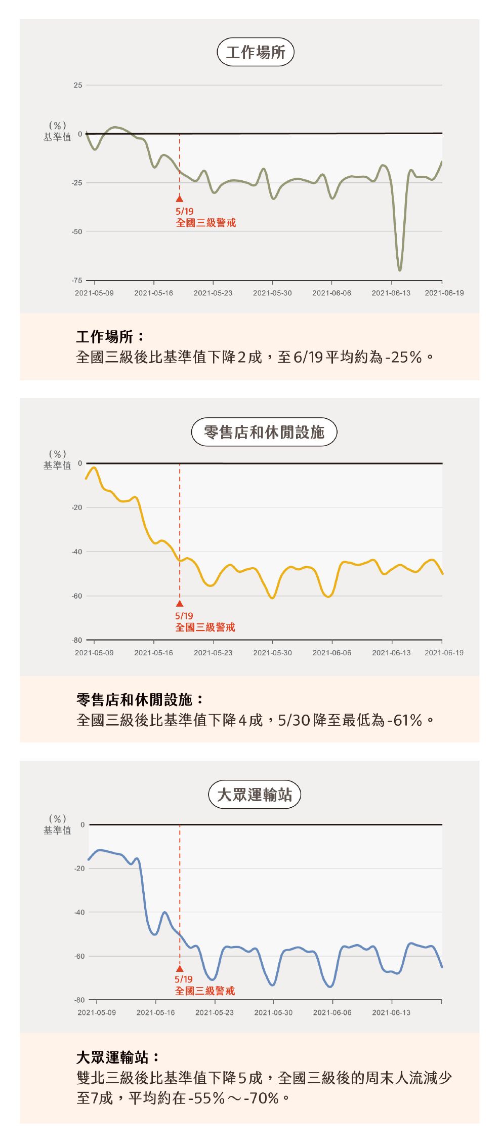 整體來看,臺灣雖只升級到三級警戒,但人潮與車潮下降明顯。除了工作場所改變較小,其他如大眾運輸、公園、零售商店和遊樂場,社交管制都有明顯成效。詹大千分析:「從人流數據來看,臺灣雖然沒有強制封城,但民眾的自律和防疫配合度高,足夠達到自主封城的效果。」