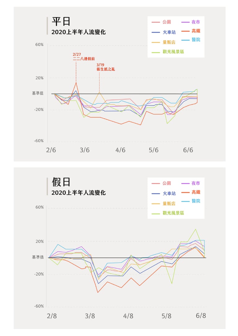 「Google 沒有針對市場、高鐵、量販店做統計,但想判斷臺灣人潮群聚,這類場所很重要,有助於觀察人流熱區。」舉例來說,分析遠傳數據資料,去年 3 月量販店曾出現一波尖峰。回頭推敲,彼時正好是去年的「衛生紙之亂」,透過圖表,即能清晰反映出常民生活面貌。