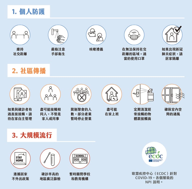 根據世界衛生組織(WHO)列表,NPI 措施可以從個人防護、生活環境到社會大規模的限制規範,透過非疫苗與藥物的手段遏制疫情。歐盟也針對 COVID-19 詳細列出十幾項 NPI 措施,包含手部消毒、戴口罩、隔離檢疫等。