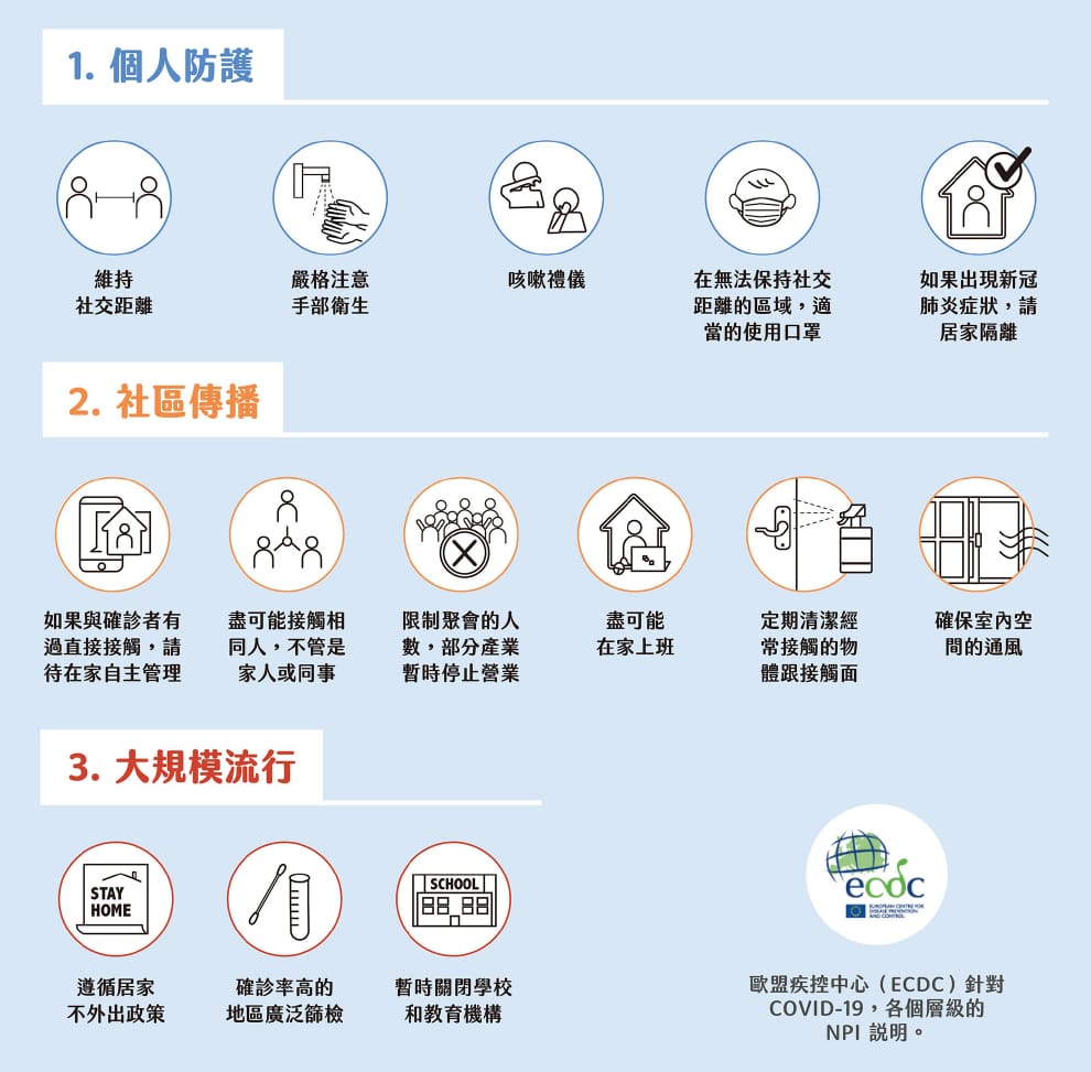 歐盟疾控中心(ECDC)針對 COVID-19,從個人防護、社區傳播、大規模流行,提出各個層級的 NPI 說明。