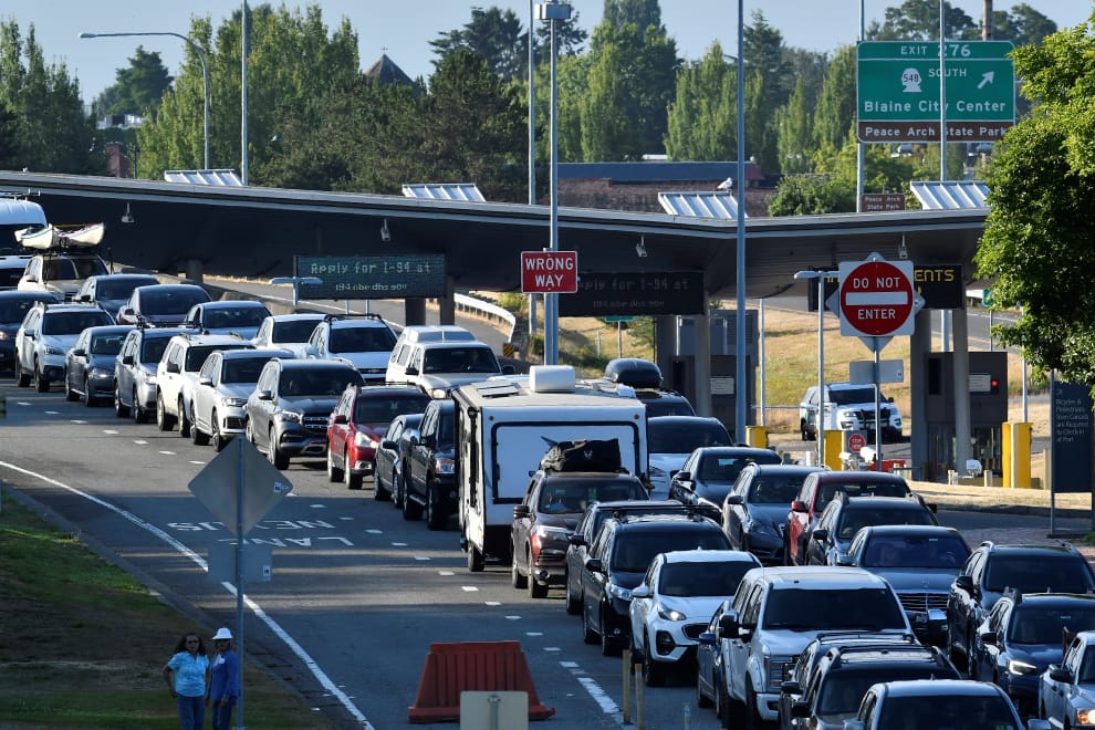 在英屬哥倫比亞省(British Columbia)的城市素里(Surrey),大批車輛正在位於美加邊境的和平拱門(Peace Arch)附近排隊,等著獲得通關許可,進入加拿大。