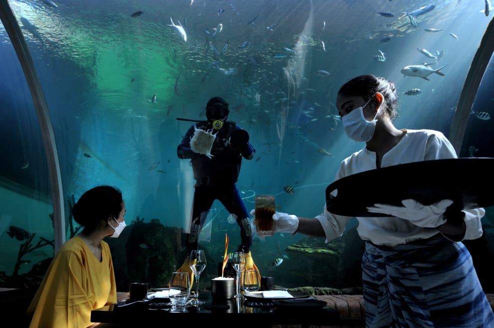 在峇厘島的努沙杜瓦(Nusa Dua),顧客正於一間內建水族館的餐廳「Koral」用餐,在服務人員為他們端上飲料時,一旁的玻璃牆後是正在水中擦玻璃的潛水員。