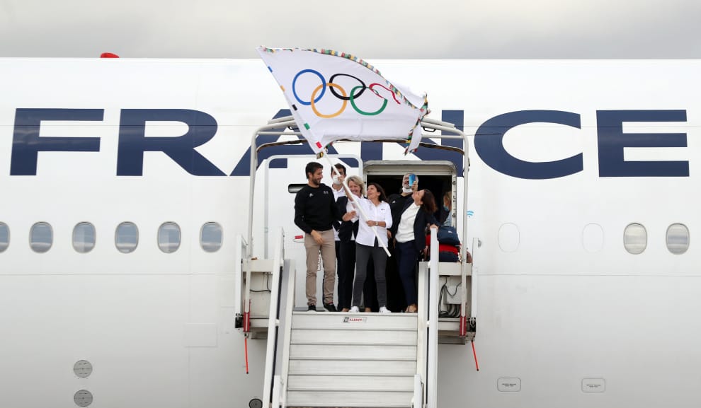 在法國,該國的奧運選手帶著奧運會旗一起返抵了巴黎。本照攝於巴黎夏爾·戴高樂機場(Paris Charles de Gaulle airport),畫面中,巴黎市長伊達戈(Anne Hidalgo)正站在機艙門口揮舞奧運會旗,她身旁的黑衣男子則是 2024巴黎奧運組織委員會(Paris 2024 Organising Committee)的主席埃斯坦蓋(Tony Estanguet)。