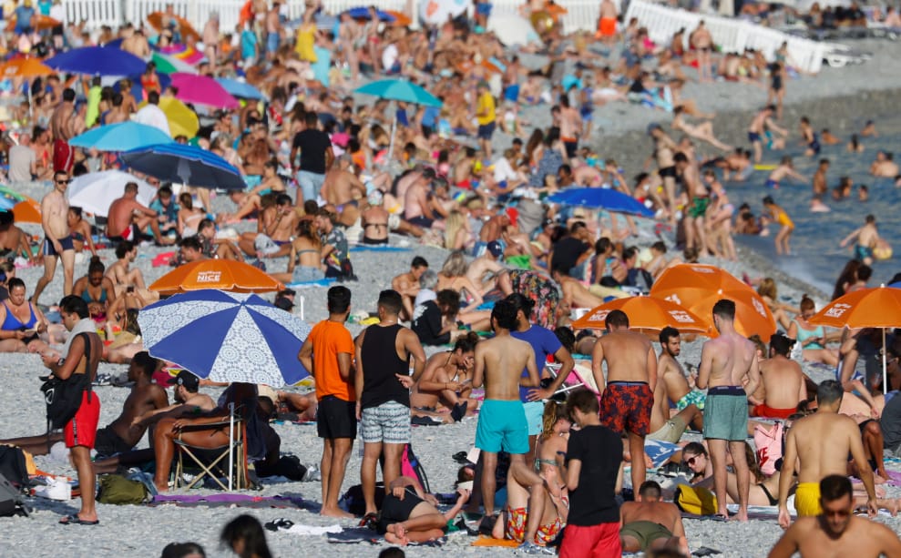 在尼斯(Nice)的盎格魯街(Promenade des Anglais)海濱,大批當地民眾聚集在沙灘上,享受溫暖的夏日陽光。