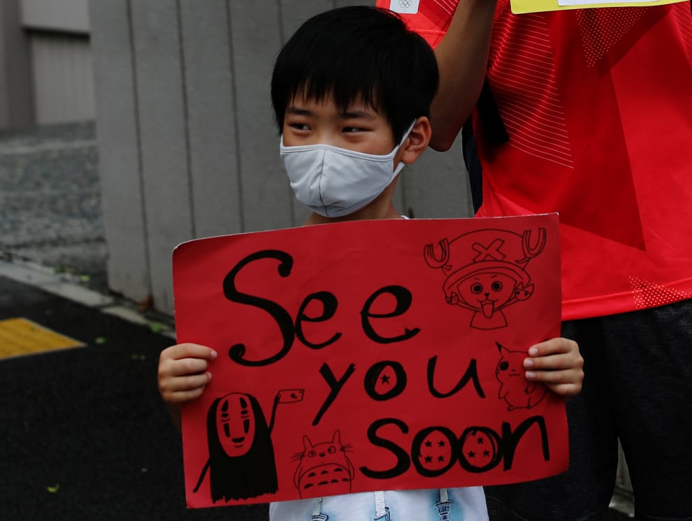 在 2020東京奧運的選手村外,一名小男孩雙手拿著寫上了「後會有期」(See you soon)的看板,為特地來到日本參賽的選手們送別。