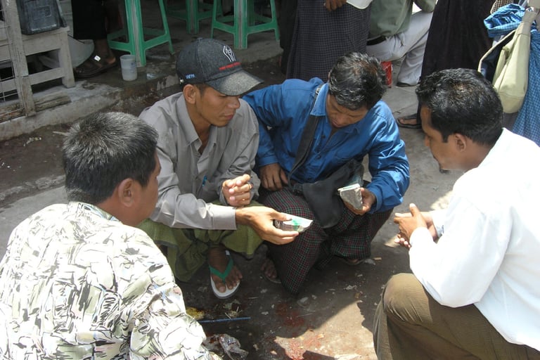 緬甸最著名的玉石貿易,亦是如此。緬甸玉石開挖已有數百年,過去挖玉石叫「挖洞子」。依照傳統,找到未被開採之處,插個樹枝示意為有主之地,就能以簡單的器具挖掘。