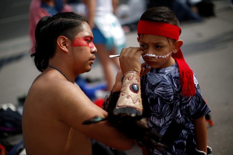 在首都墨西哥城(Mexico City)的佐卡洛廣場(Zocalo Plaza),一名已經完成裝扮的男子在幫一個孩子畫臉,他們正準備要參加特諾奇提特蘭陷落之日(Fall of Tenochtitlan)滿 500周年的紀念活動。