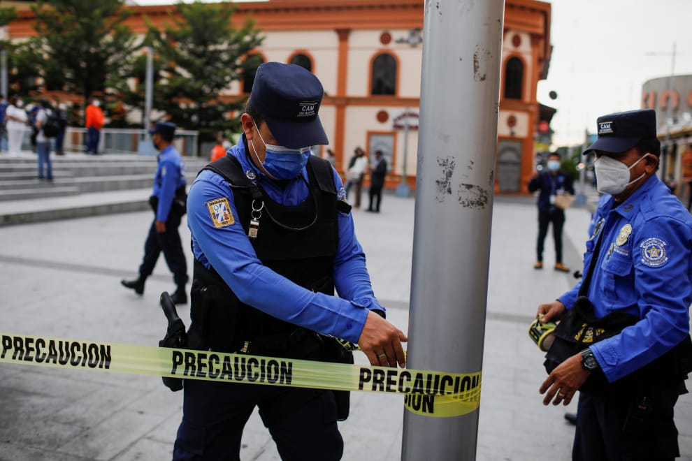 在首都聖薩爾瓦多(San Salvador),當地政府為了避免COVID-19疫情升溫,決定關閉市中心所有的公園,以防止民眾進行大型集會。畫面中,該市的警察們正在弗朗西斯科·莫拉桑廣場(Francisco Morazan Square)周邊拉上禁止入內的黃色封鎖線。