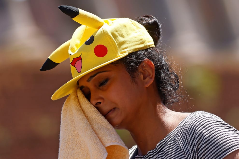 在熱浪來襲的炎炎夏日,一名頭戴皮卡丘造型帽的女子正走在首都羅馬的街頭,過於炎熱的天氣讓她忍不住頻頻拿出毛巾拭汗。
