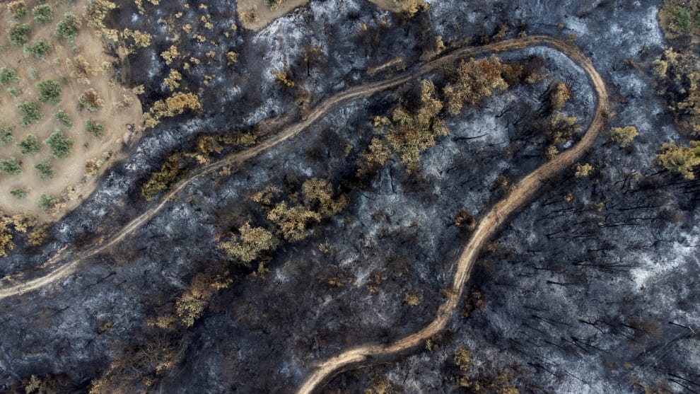 在首都雅典東北方的尤比亞島(Evia),自本月 3號開始延燒的火災至今仍未停歇。本照攝於島上村莊佩奇(Pefki)附近的山區,被大火摧殘過的森林變得一片焦黑。
