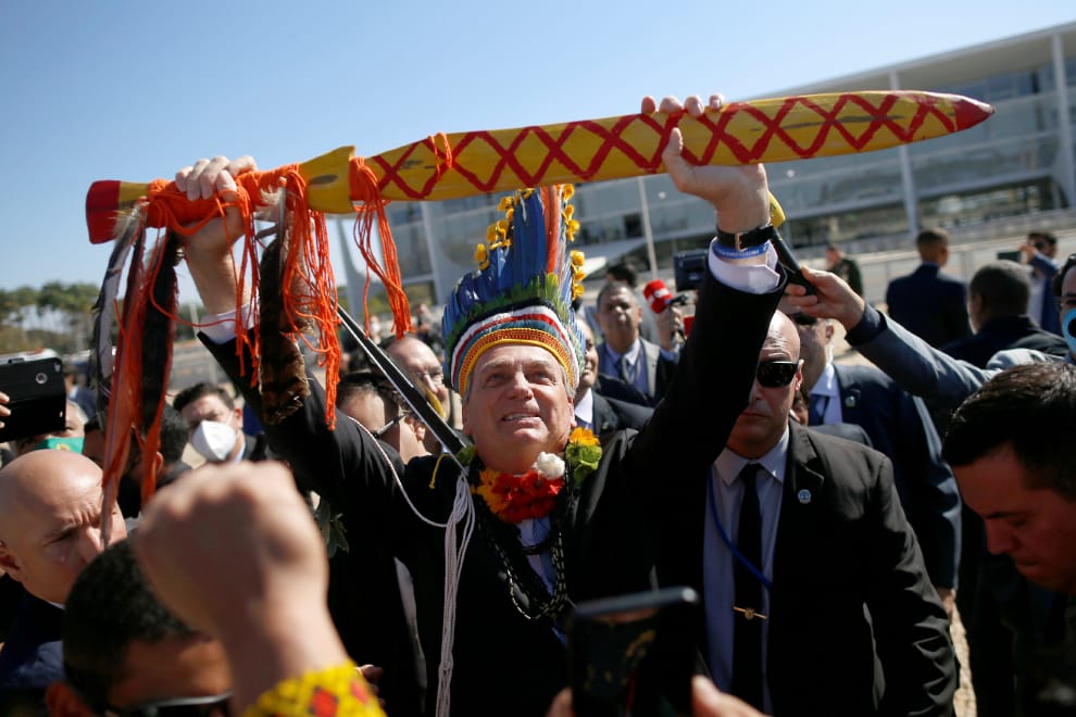 在首都巴西利亞(Brasilia)的普拉納托宮(Planalto Palace)外,被原住民支持者圍繞的總統波梭奈羅(Jair Bolsonaro)頭戴傳統服飾,手則高高舉起了一把經過彩繪的木劍。
