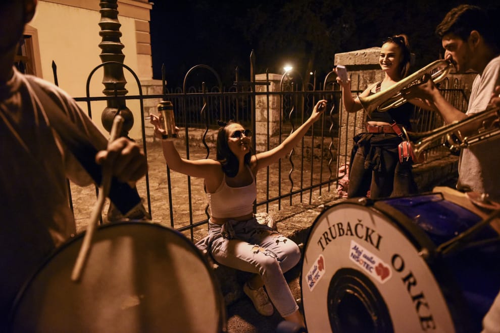 在小鎮古薩(Guca)一年一度的小號音樂祭(Guca Trumpet Festival)中,一名被樂手環繞的女子正沉浸於音樂的美好。
