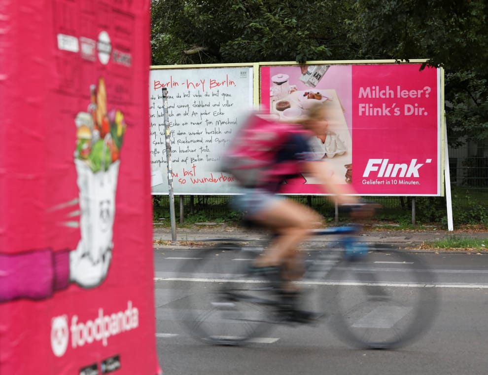 在首都柏林,一名外送員正騎著單車,準備將商品送到消費者的手上,當他從街頭疾駛而過時,恰好經過了兩家外送品牌「Flink」和「foodpanda」的廣告看板。