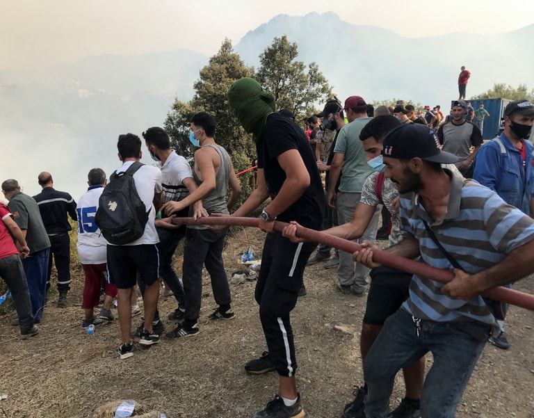 在北方城市提濟烏祖(Tizi Ouzou),鄰近的卡比利亞山區(Kabylie region)出現了野火,住在當地村莊的居民接力扛著水管,嘗試合力撲滅火勢。