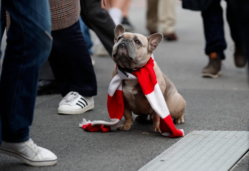 本照攝於賓福特社區球場外,一隻法國鬥牛犬圍著代表賓福特足球會的紅白圍巾,準備在待會和主人一起進場觀看比賽。