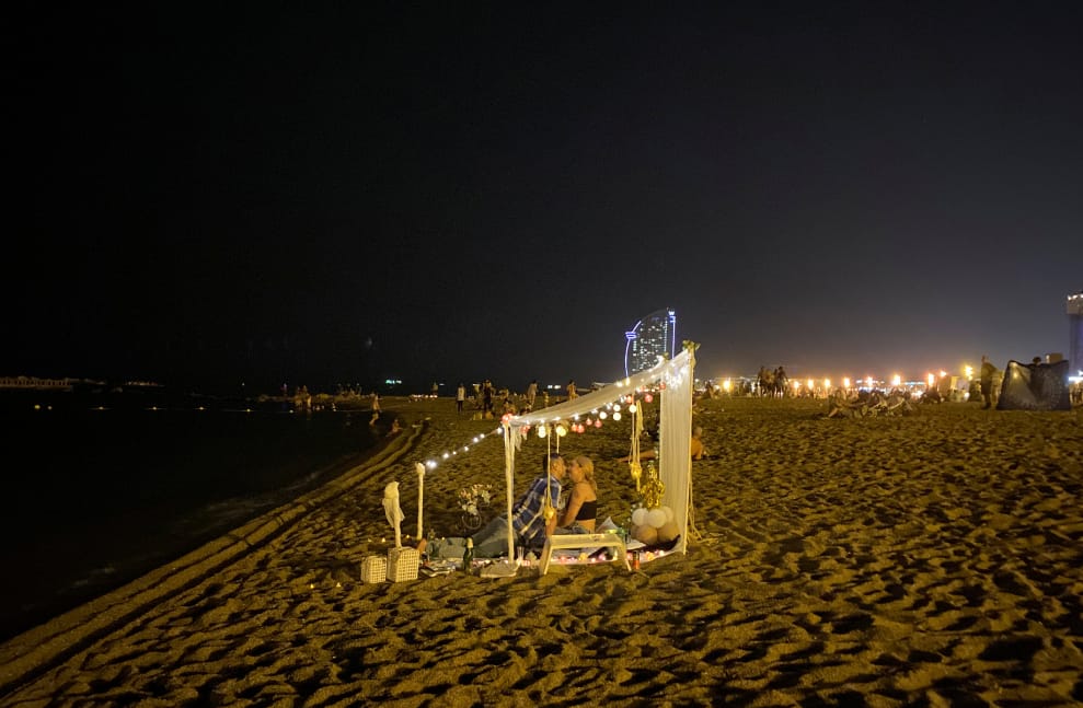 在巴塞隆納的巴塞羅內塔(La Barceloneta)海灘,來自厄瓜多的 33歲女子塔蒂亞娜(Tatiana)正在和來自委內瑞拉的 36歲男友曼德茲(Richard Mendez)一起慶祝自己的生日,涼爽的夏夜為他們的約會帶來了一絲浪漫的氣息。