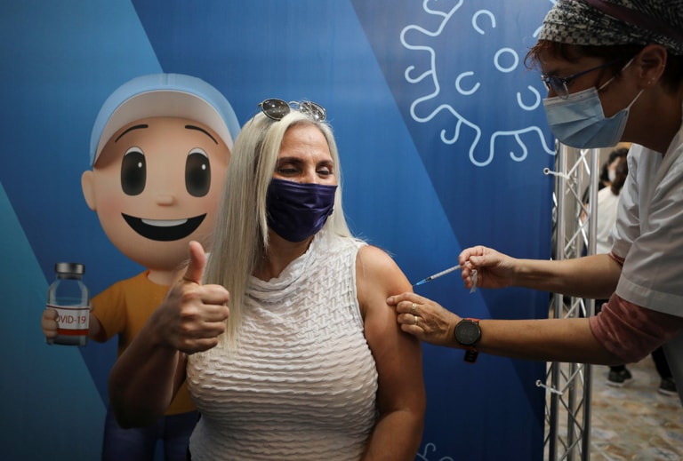 在耶路撒冷(Jerusalem),一名女子正在醫療照護組織「克來利特」(Clalit)接種第三劑 COVID-19疫苗,她在針頭刺進手臂時比出了一個大大的讚。