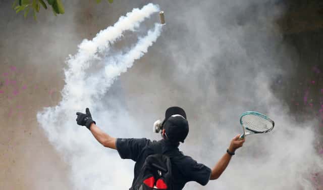 在首都曼谷,針對政府COVID-19疫情防範不力的抗議仍然在持續中,一名身在現場的示威人士在面對前來鎮壓的警察所投擲的催淚瓦斯時,拿出了自己準備好的球拍,打算將它一擊拍飛。