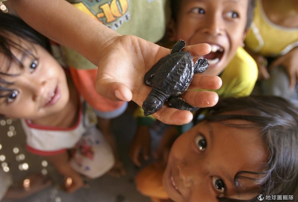 小朋友們擠在一塊觀察小革龜。