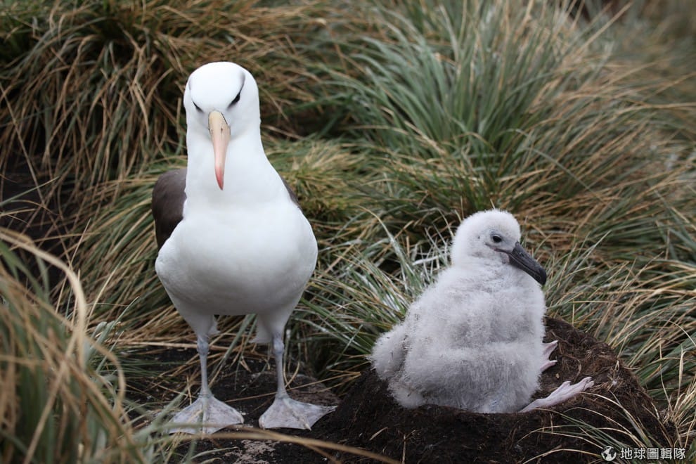 網友照片中是黑眉信天翁的成鳥和幼鳥,牠們的保育狀態從瀕臨滅絕的降低到近危。photo credit: wikicommons