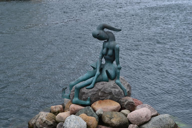 在距離丹麥首都哥本哈根 300多公里的阿索小鎮(Asaa),人們以擺放在港口的小美人魚雕像為傲。這尊雕像和位於哥本哈根的小美人魚雕像乍看之下有點像,同樣都以右手撐住屁股底下的岩石,同樣都將有著魚尾特徵的雙腳安放於岩石上,同樣都梳著微微旁分的髮型,然而,這尊從 2016年就安放在阿索港口的小美人魚雕像,並不是哥本哈根小美人魚雕像百分百的複製品。