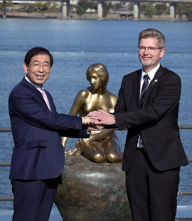 1913年雕像完成後,雅布克森將小美人魚雕像送給了哥本哈根市,這尊雕像從此被安放在長堤公園的港口邊,望著遠方的大海。