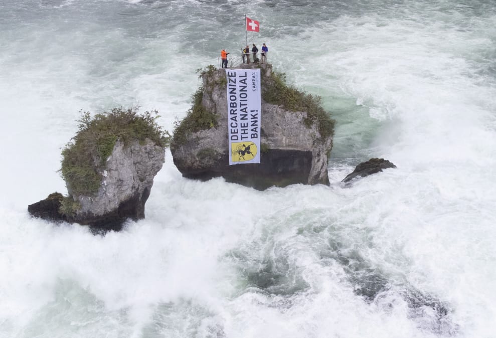 在城鎮諾伊豪森(Neuhausen am Rheinfal),環保團體「Campax」的成員跑到萊茵瀑布(Rhine Falls)周邊的岩石上,以掛布條的方式呼籲瑞士國家銀行(Swiss National Bank)不要再投資化石燃料計畫,並往環境友善的路線發展。