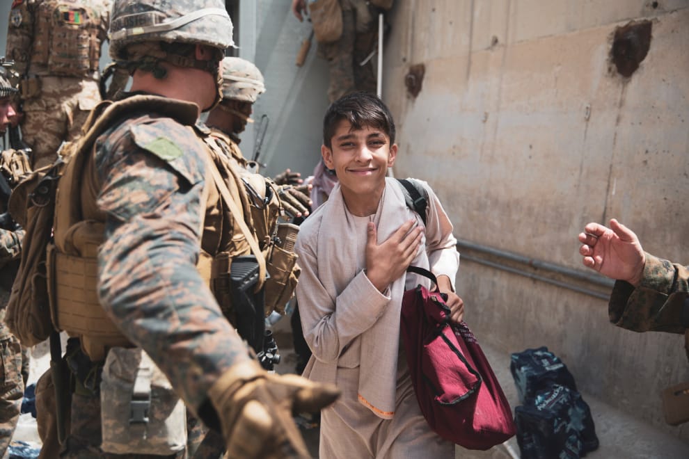 在首都喀布爾(Kabul)的哈米德·卡爾扎伊國際機場(Hamid Karzai International Airport),一名面帶微笑的男孩正要通過美軍的疏散控制檢查哨(Evacuee Control Checkpoint)。