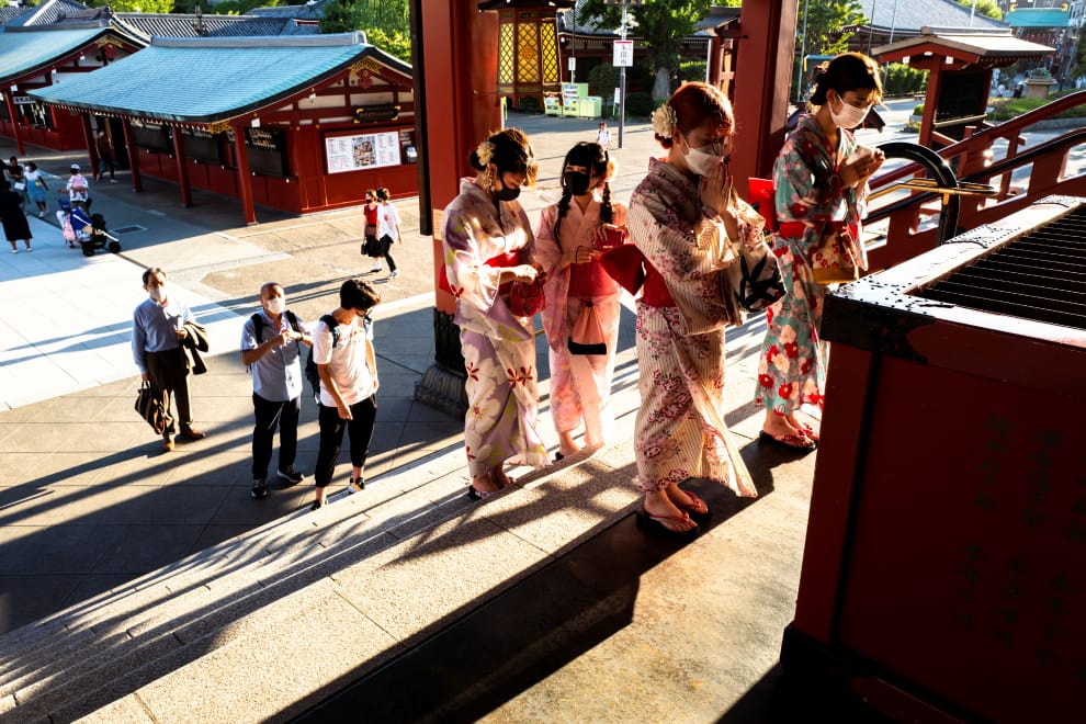 在東京的淺草寺,幾名穿著和服的女子,正閉上眼睛、雙手合十,虔誠地向神明祈禱。