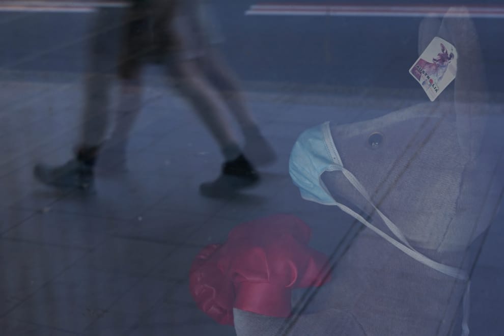 在雪梨封城期間,一隻戴著口罩的袋鼠娃娃,正孤零零地躺在一間市中心商店的櫥窗後方。