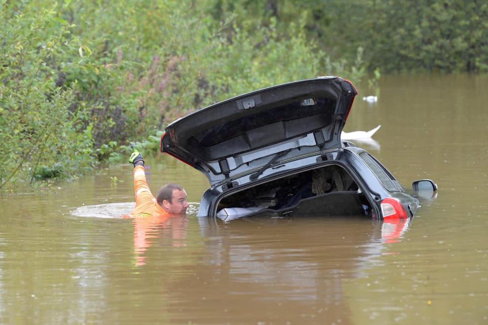 本周三,在連夜的異常豪大雨後,瑞典中部發生了大規模的洪災,本照攝於其中一座城市法倫(Falun),一名救難人員正在靠近一輛被大水淹沒的車子。