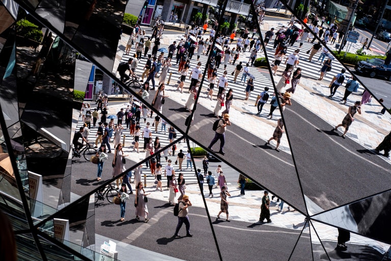 在東京,一間購物中心的外牆上映照出了城市的熱鬧,許多民眾正於道路上來來去去,準備前往各自的目的地。