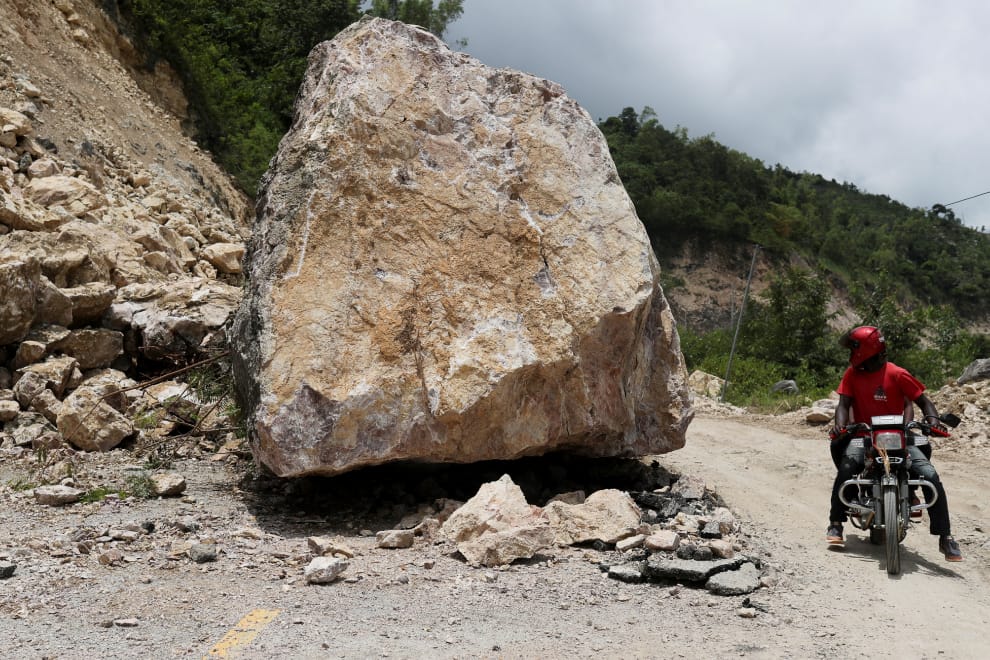 在城市萊凱(Les Cayes)的附近,一塊巨大落石橫在了路邊,道路因此被部分封鎖,影響通行。本月 14號,海地西南部區域發生了規模 7.2的強震,目前已經造成了至少 2,189人死亡,約 150萬人生活受到影響,包括缺少醫療資源、失去住所、沒有自來水和食物等,搜救行動至今仍在持續中。