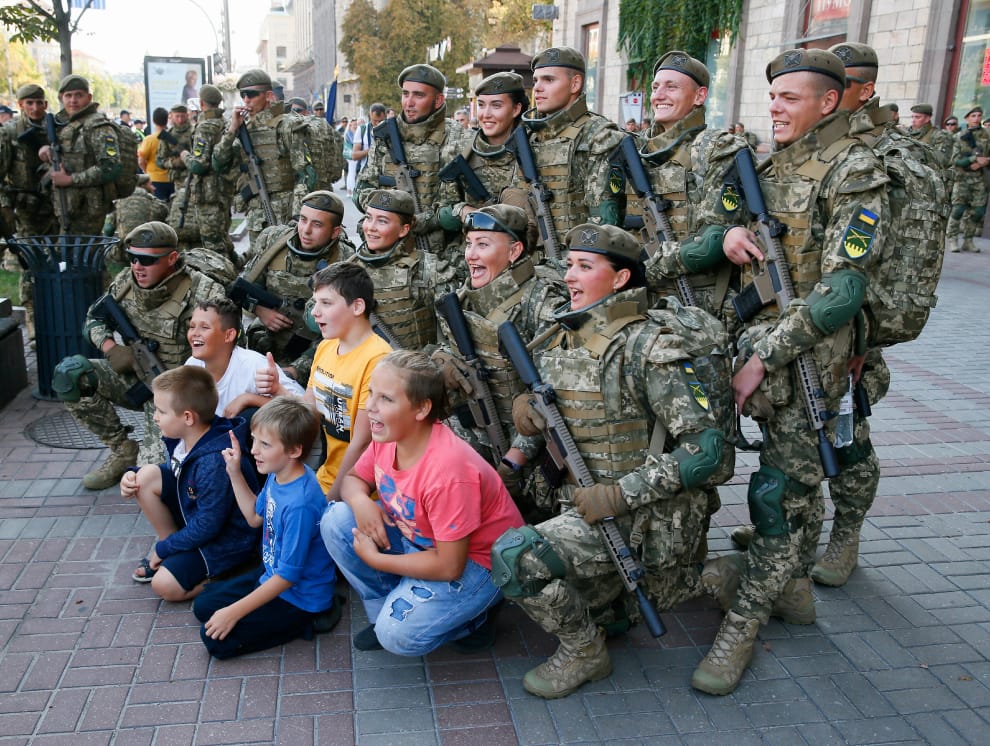 在首都基輔(Kyiv)的市中心,為了迎接即將於 8月24日來臨的烏克蘭獨立紀念日,烏克蘭軍人正在街頭進行閱兵典禮的彩排。本照攝於彩排中途,來觀看演練的孩子開心地和全副武裝的軍人們合影。