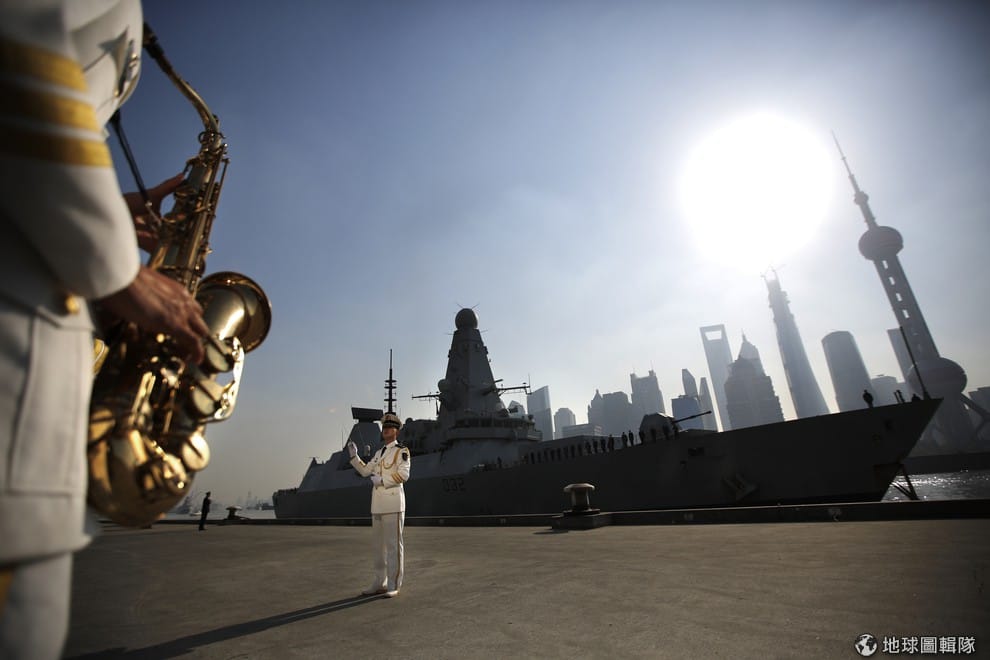 迎接英國皇家海軍驅逐艦勇敢號(British Royal Navy destroyer HMS Daring)的到來,上海市區的黃浦江旁出現歡迎儀隊表演