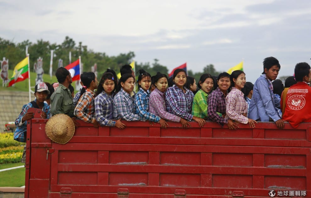 站在卡車上的工人們等著上工。緬甸即將在12月11-22日舉辦東南亞運動會(Southeast Asian (SEA) Games)