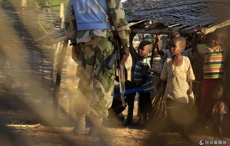 因為內戰流離失所的孩子們看著站在一旁聯合國指派的維和部隊軍人,蘇丹當地在4月時發生政府與軍事組織衝突的事件,許多居民因此受波及必須撤離家園,當地就有數千民眾希望能躲避到維和部隊的營區中