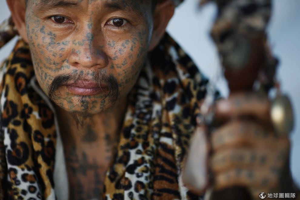一名要求總理盈拉下台的示威男性的臉上佈滿刺青