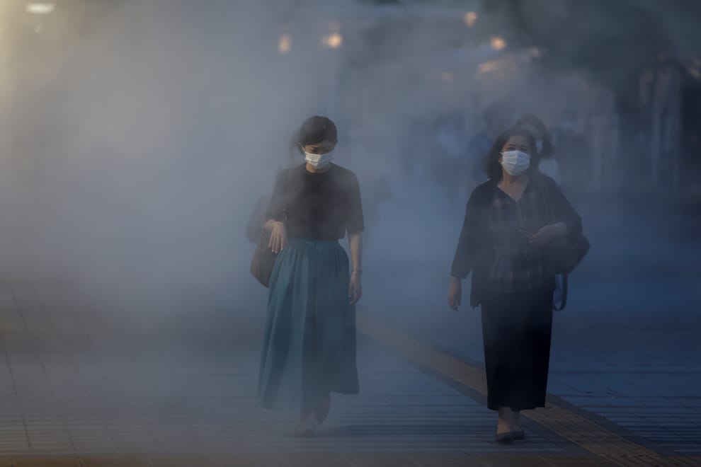 在東京街頭,人們在下班尖峰時間走過為了降溫、落塵噴出的水霧。