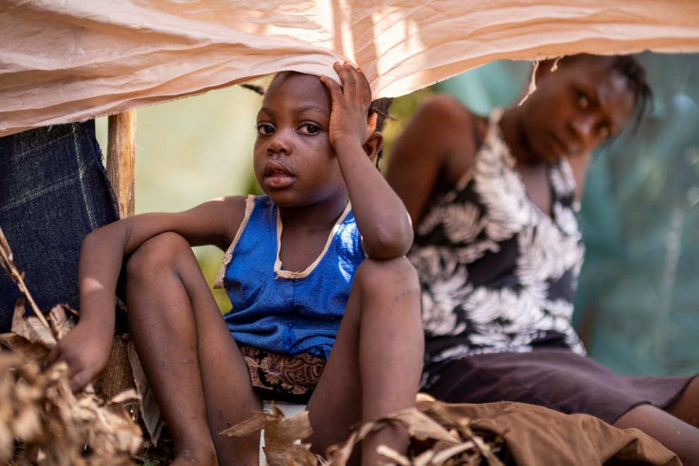 在佩斯特爾(Pestel)的Nan Konsey社區,一名小女孩在臨時搭建的救難帳篷中看向鏡頭,她的家在大地震中被夷為平地,只得跟著家人到臨時避難處先落腳再說。