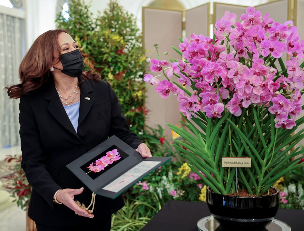 在新加坡總統府,前來參訪三日的美國副總統賀錦麗(Kamala Harris)正在參與蘭花命名典禮,她也在這場典禮上收到了以自己的名字命名的蘭花──Papilionanda Kamala Harris,新加坡的這份禮物也被稱為「蘭花外交」,靠著當地最著名的花卉贏得友邦的心。