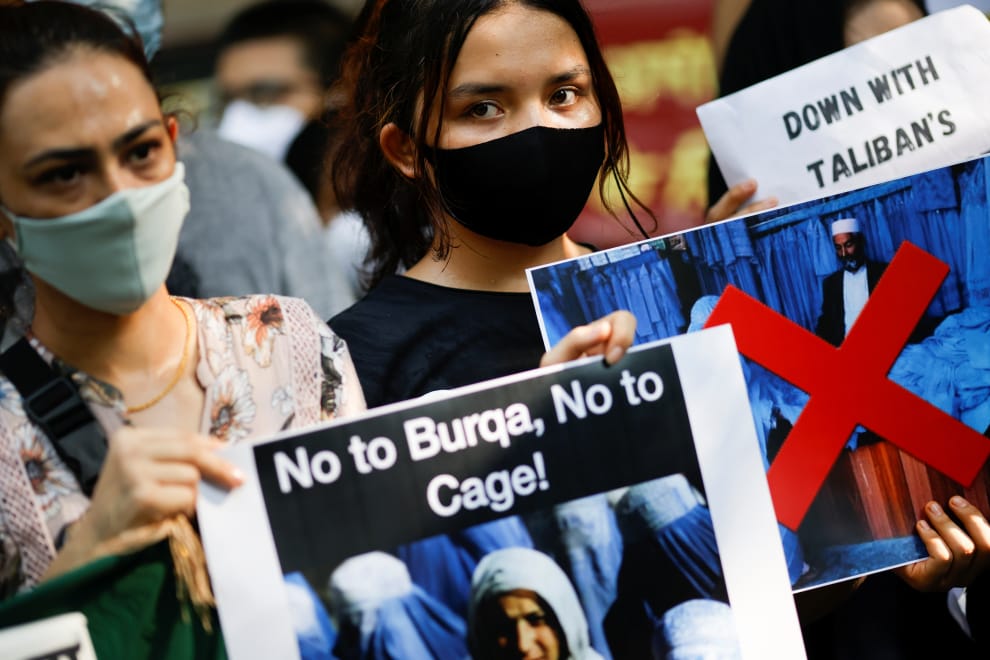 在首都新德里,來自阿富汗的女性手拿海報聲援仍待在家鄉的同胞,海報上寫著「向布卡(Burqa)說不,向牢籠說不」以及「受夠塔利班(Taliban)」等字樣,抗議塔利班在阿富汗掌權,她們也擔心捲土重來的塔利班會箝制女性自由,讓阿富汗的女性回到黑暗時代。