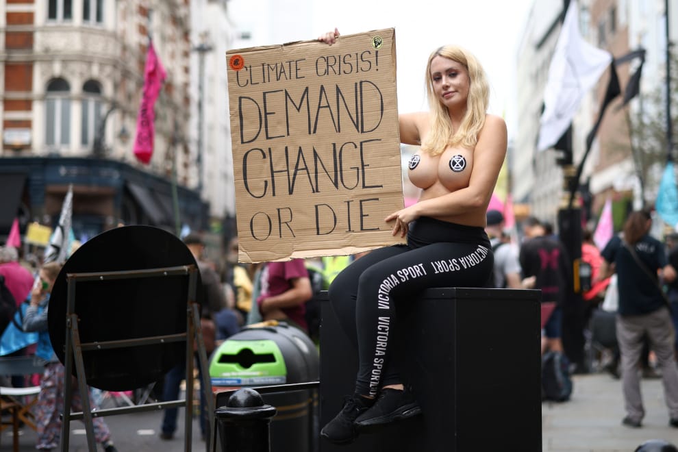在倫敦街頭,參與環保團體「滅絕反叛」(Extinction Rebellion)活動的民眾紛紛上街,其中一名女子手拿寫著「氣候危機!不改變就等死」字樣的紙板拍照。